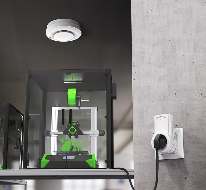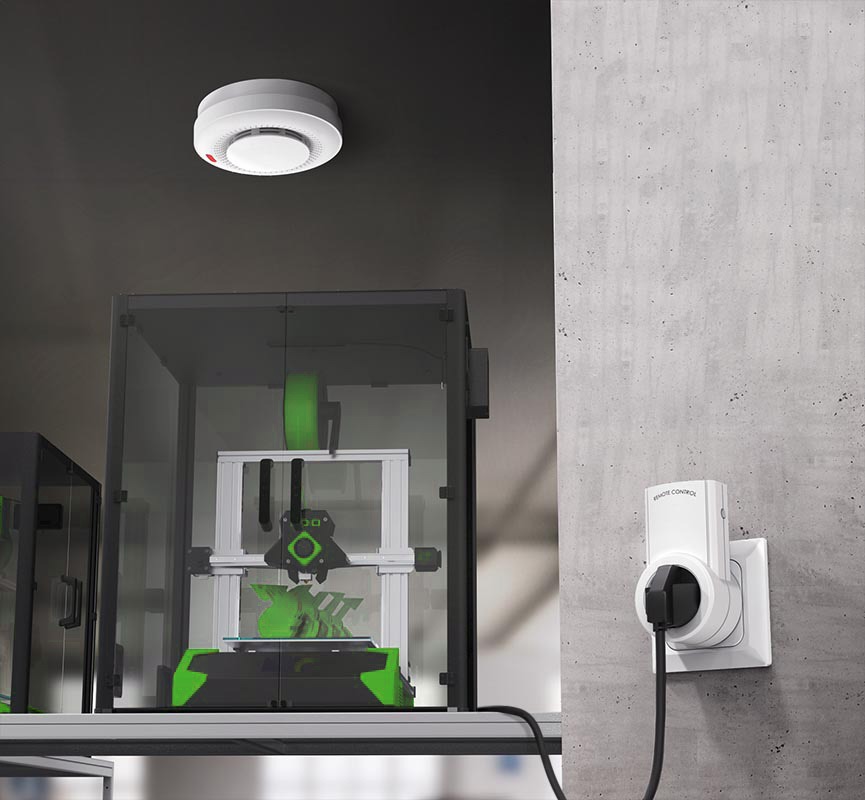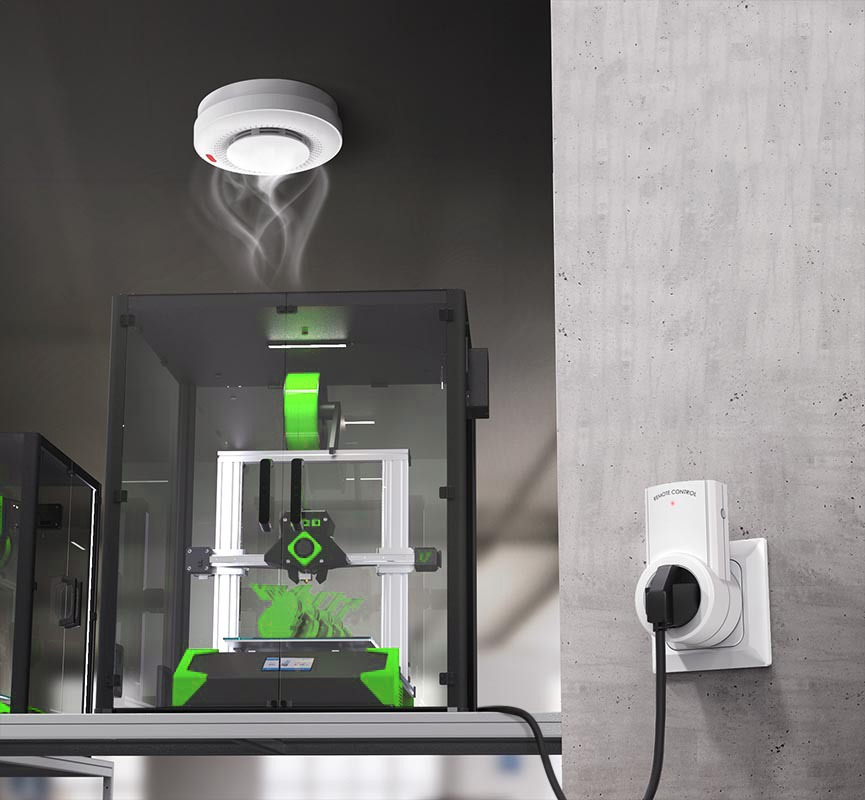 Le détecteur de fumée sans fil, envoie un signal radio à la prise électrique pour couper l’alimentation de votre imprimante 3D.