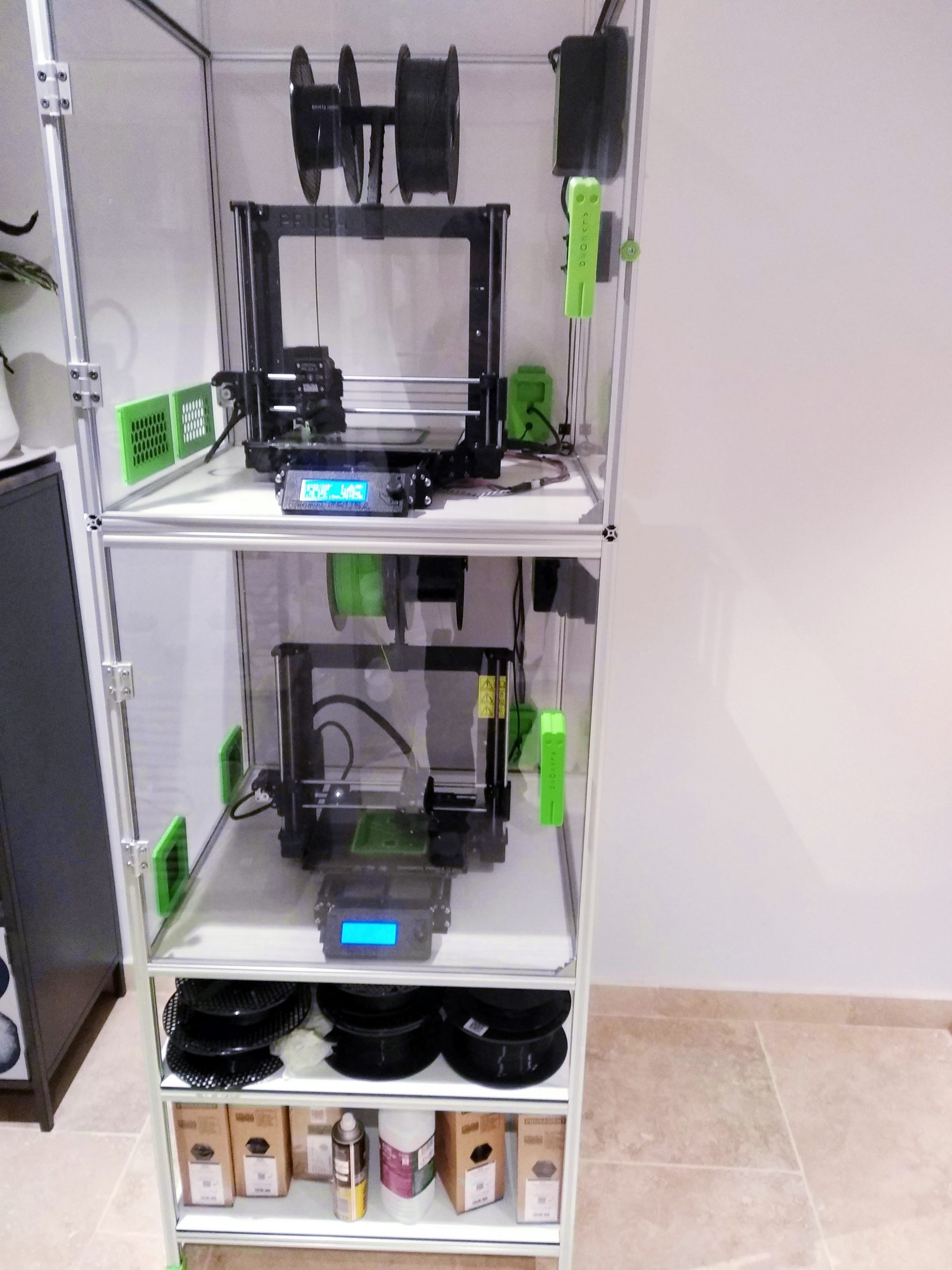 Fire safety, smoke detector, shelves for storage, opaque panel for UV safety (SLA printing), lighting, filament spool holder…