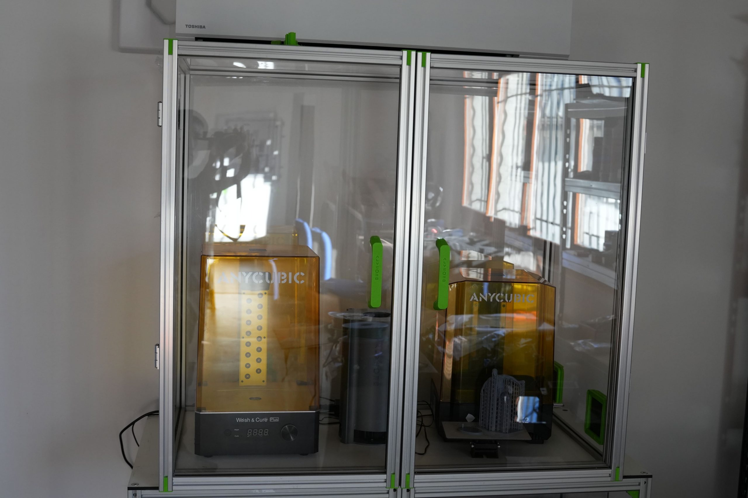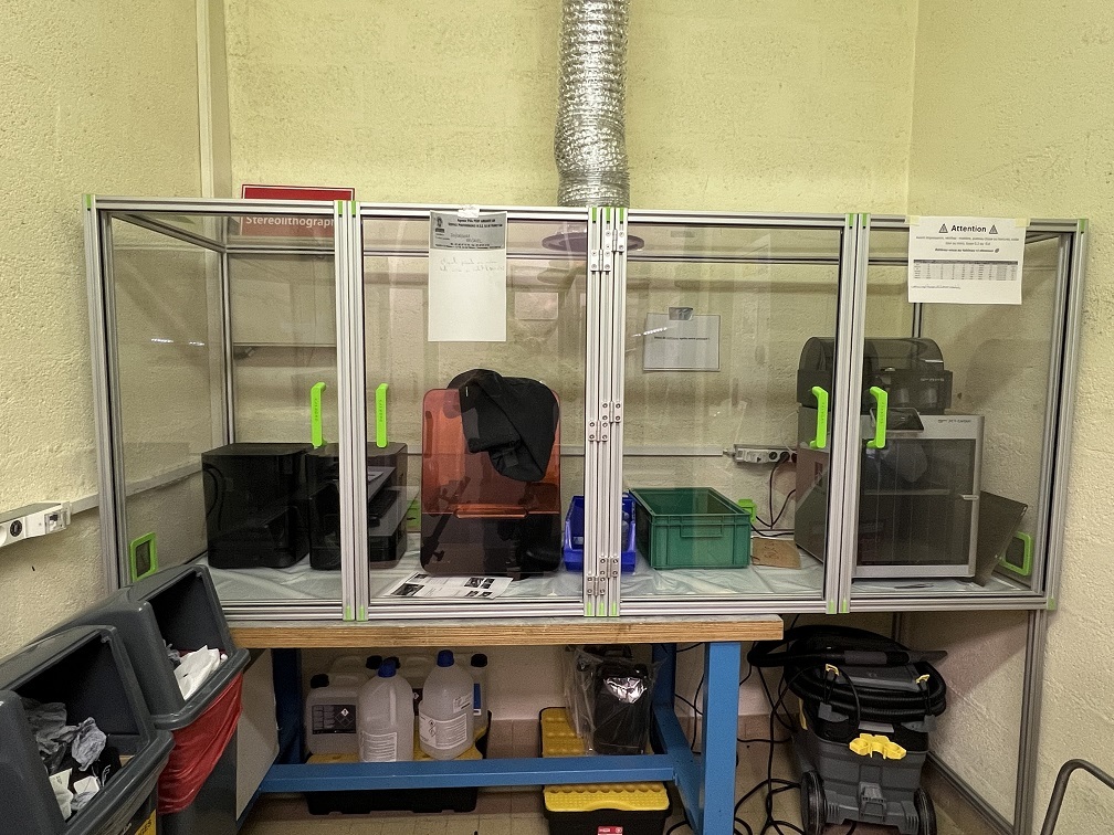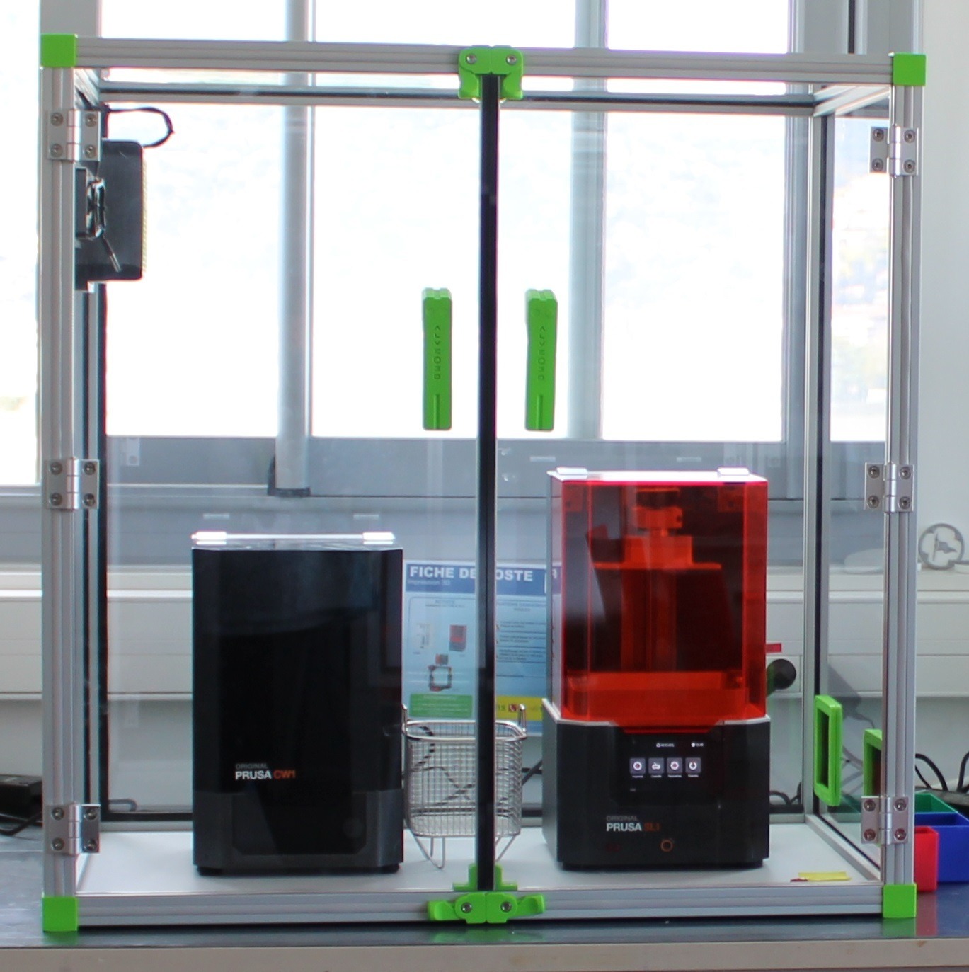 Sécurité incendie, support avec étagères pour rangement, panneaux opaques pour protection UV (impression SLA), éclairage, support de bobine de filament…